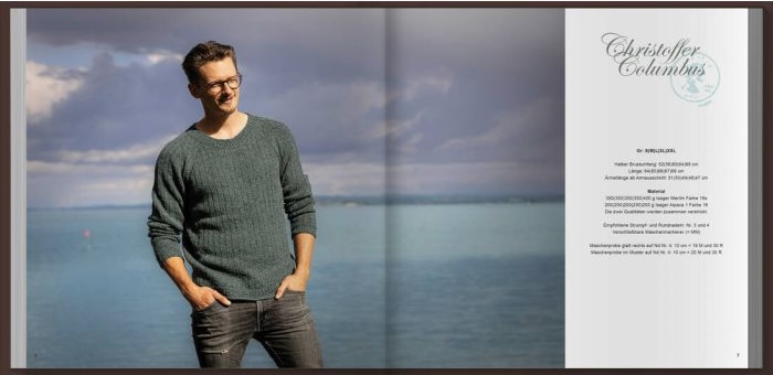 Die Pullover werden teilweise einfarbig in sehr feinen maskulinen Mustern gestrickt, wie z.B. der sehr schöne Pullover „Christoffer Columbus“ und auch das Titel-Modell „Erik der Rote“ oder das Modell „Dr. David Livingstone“, welches etwas markanter mit einem keltisch anmutenden Zopfmuster in der Rückenmitte und auf den Ärmeln gestrickt wird.